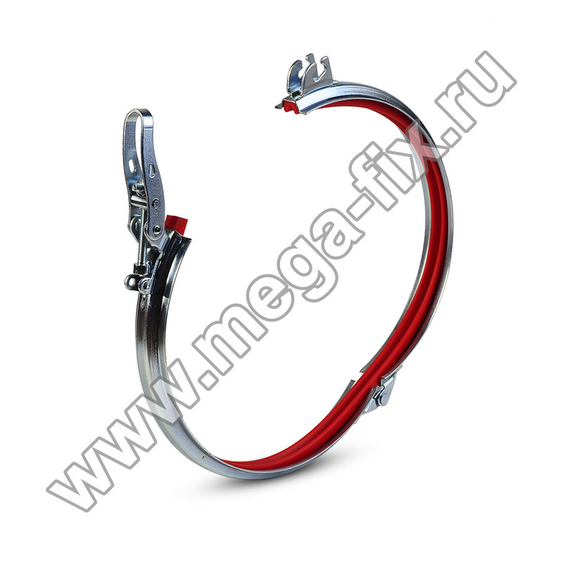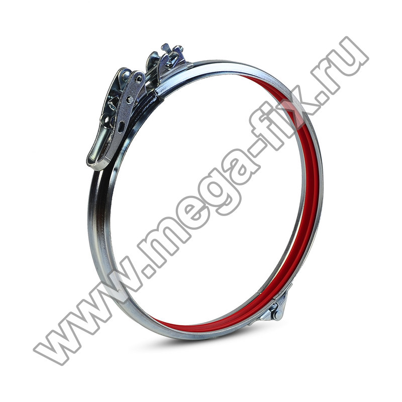 Хомут представляет собой два стальных полукольца, дополненных шарниром с клепкой, а так же быстроразъемным замком, оснащенным рычагом. Рычаг обеспечивает оперативный монтаж без необходимости использования каких-либо инструментов. Внутри хомута установлен поливинилхлоридный профиль, гарантирующий герметичность соединения.